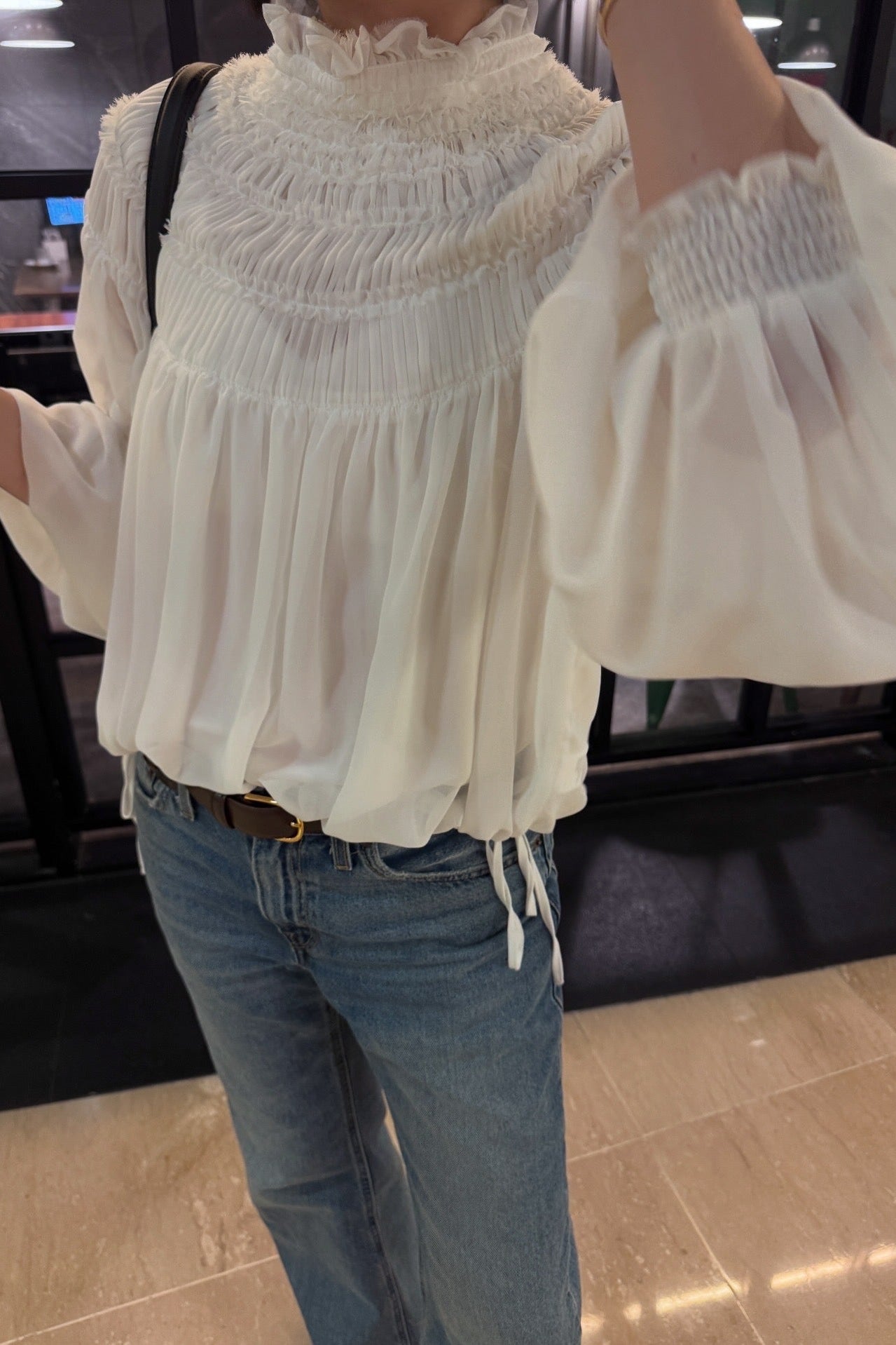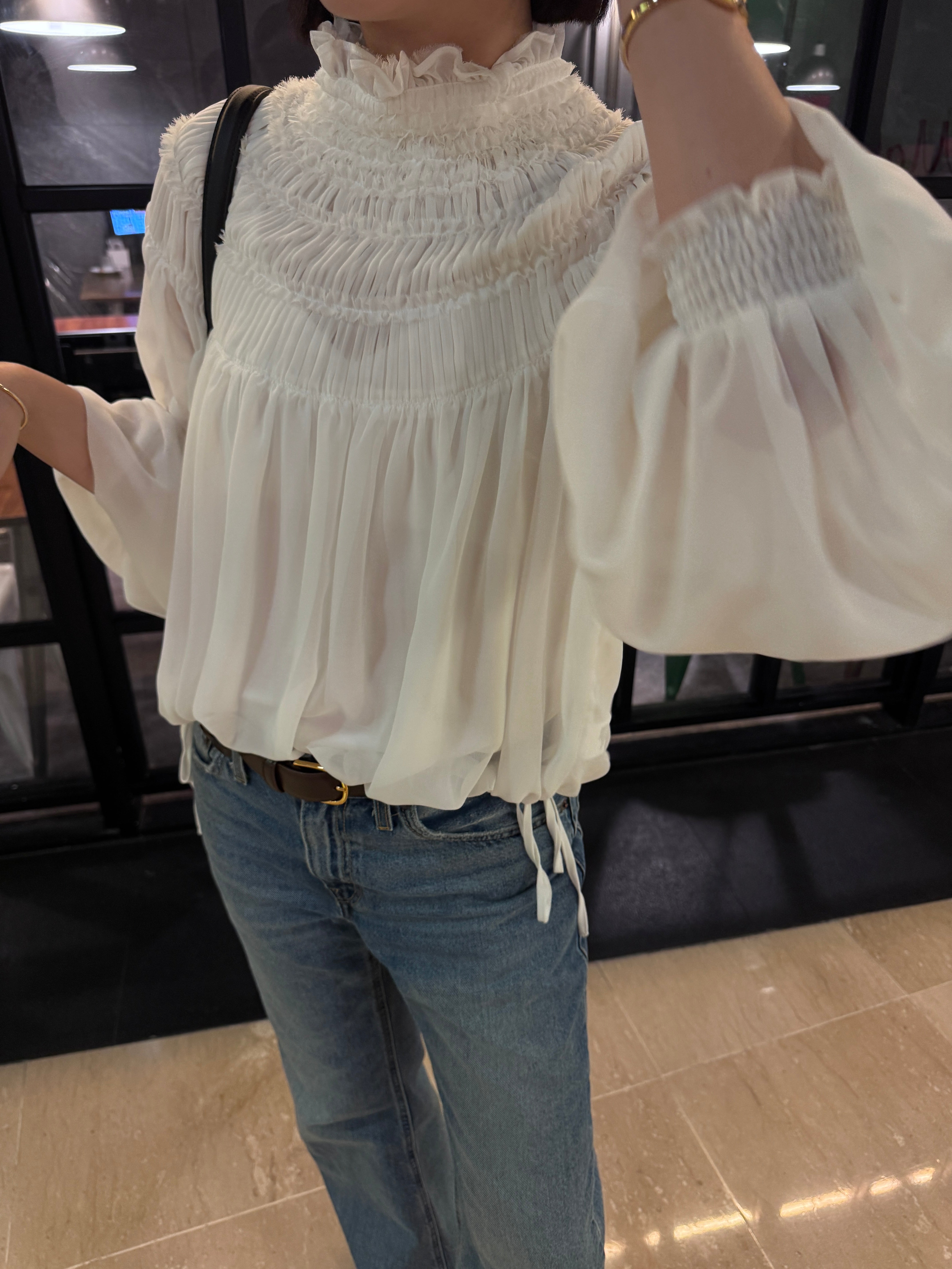 - Softly voluminous long sleeves